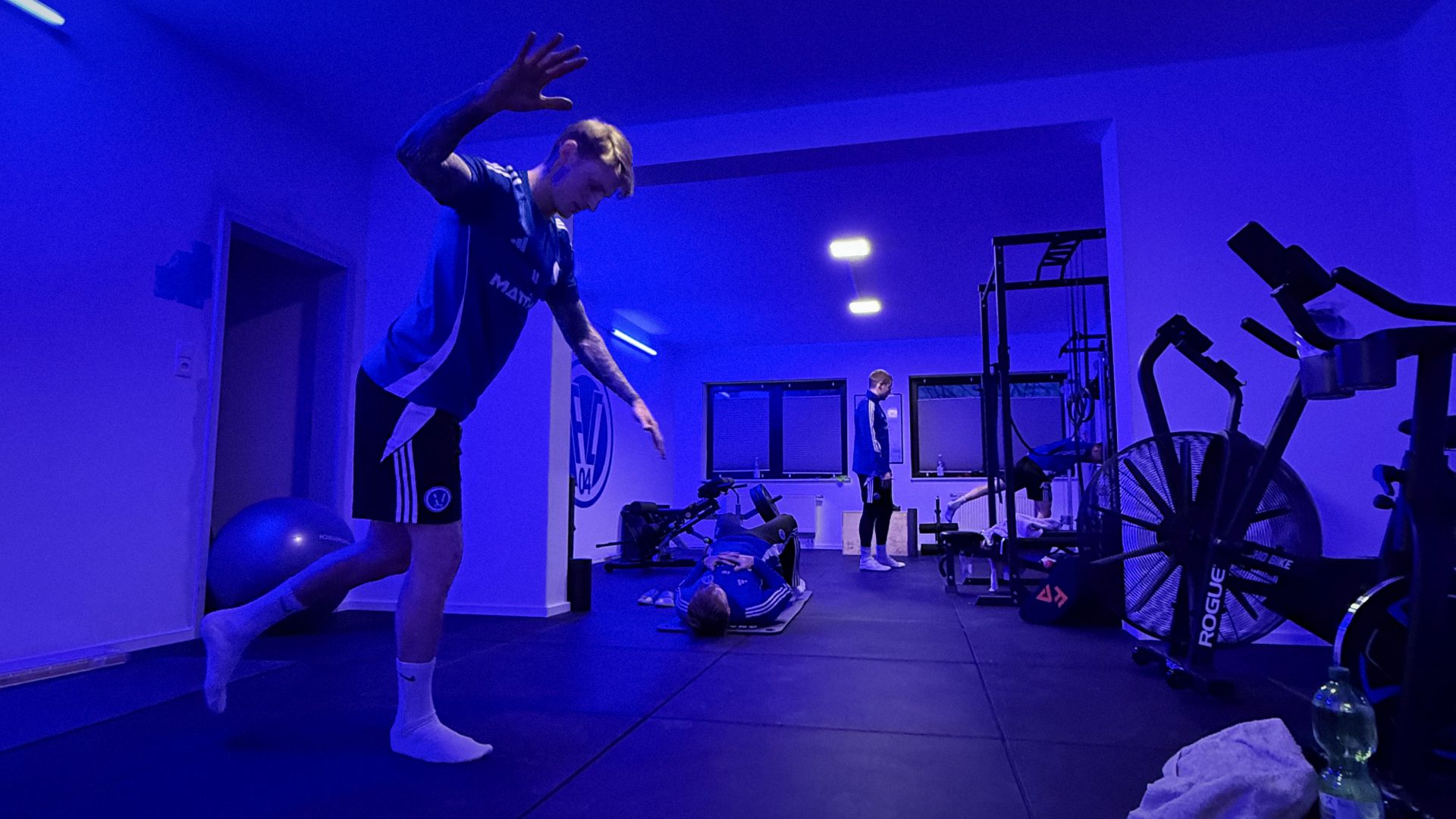 Unser Trainingszentrum am Saumurplatz ist wie alle anderen Flächen ebenfalls komplett eingeschneit. An richtiges Training mit Ball ist hier nicht zu denken. Deshalb müssen kreative Lösungen her. Die aktuell renovierten Räumlichkeiten im Vereinsheim bieten glücklicherweise genügend Platz, um in größeren Gruppen im Kraftbereich ordentlich trainieren zu können. Bastian Reiners weiß ganz genau, wie er die Spieler hier zum Schwitzen bringt. Individuelle Läufe bilden zur Kraft aktuell den Ausgleich im Ausdauerbereich.